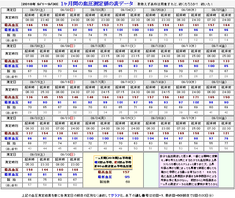![]() 当WEBサイト運営担当[2018年 9/1〜9/30] 1ヶ月間の血圧測定状況【血圧の表データ】 |